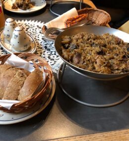 Paliels klāst ar ēdienu un divām burvīgām terasēm, viena uz ielas pusi, otra iekšpagalmā, zem kuras tek Alekšupīte. Ļoti skaita vietiņa un arī cilvēki padaudz. Pasūtījām kafijas un kvasu. Pamatēdienā izvēlējos cūgaļas šašliku ar piedevām un draugs bifšteku ar Dižonas sinepju mērci. Neteikšu, ka nereāli gards ēdiens, labākais ko esmu ēdusi, bet bija labi. Šašliks bija izcils, es pat teiktu. Pārējais ne visai. Kopā samaksājām ap 38EUR.