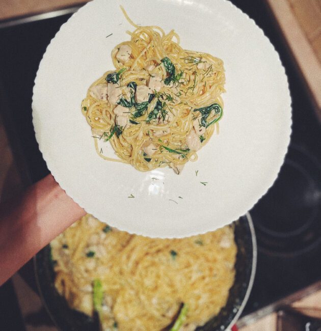 Vistiņas pusspārniņi gaileņu lečo mērcē. Lečo ir ungāru virtuves ēdiens (līdzīgs mērcei), kas gatavots galvenokārt no paprikas, tomātiem un sīpoliem.